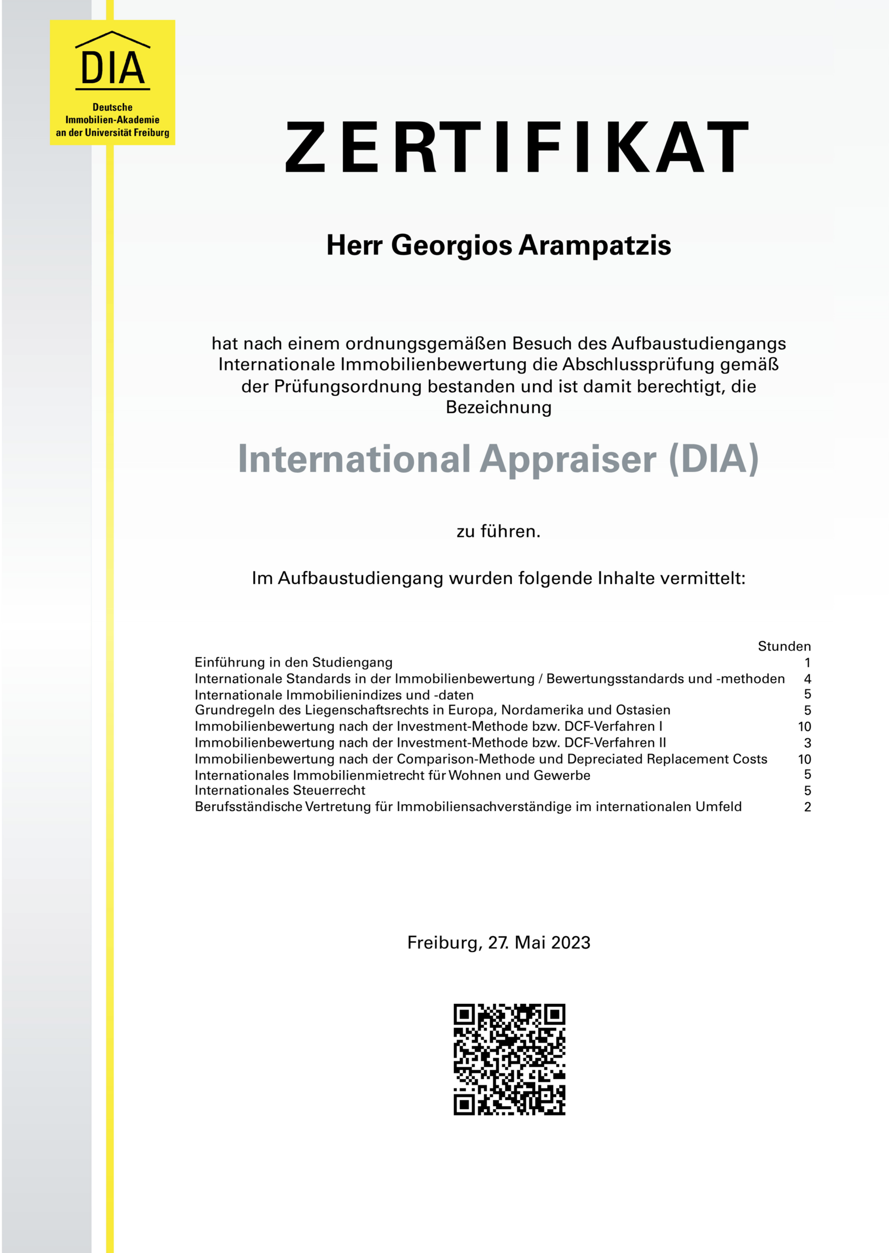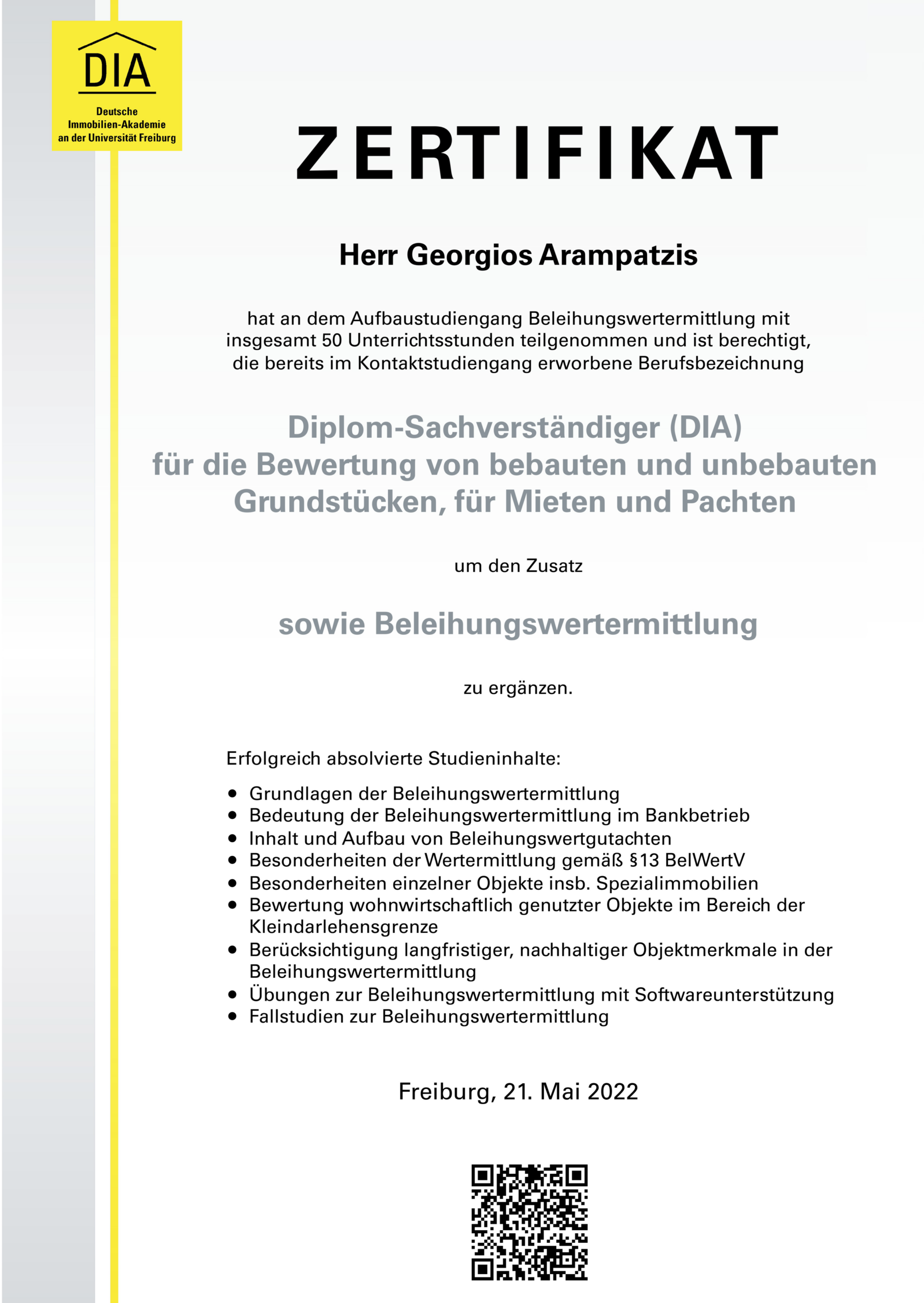Expertise in der Bewertung von Grundstücken, Mieten und Pachten nach nationalen und internationalen Standards sowie in der Beleihungswertermittlung, erworben an der Deutschen Immobilien-Akademie an der Universität Freiburg GmbH.